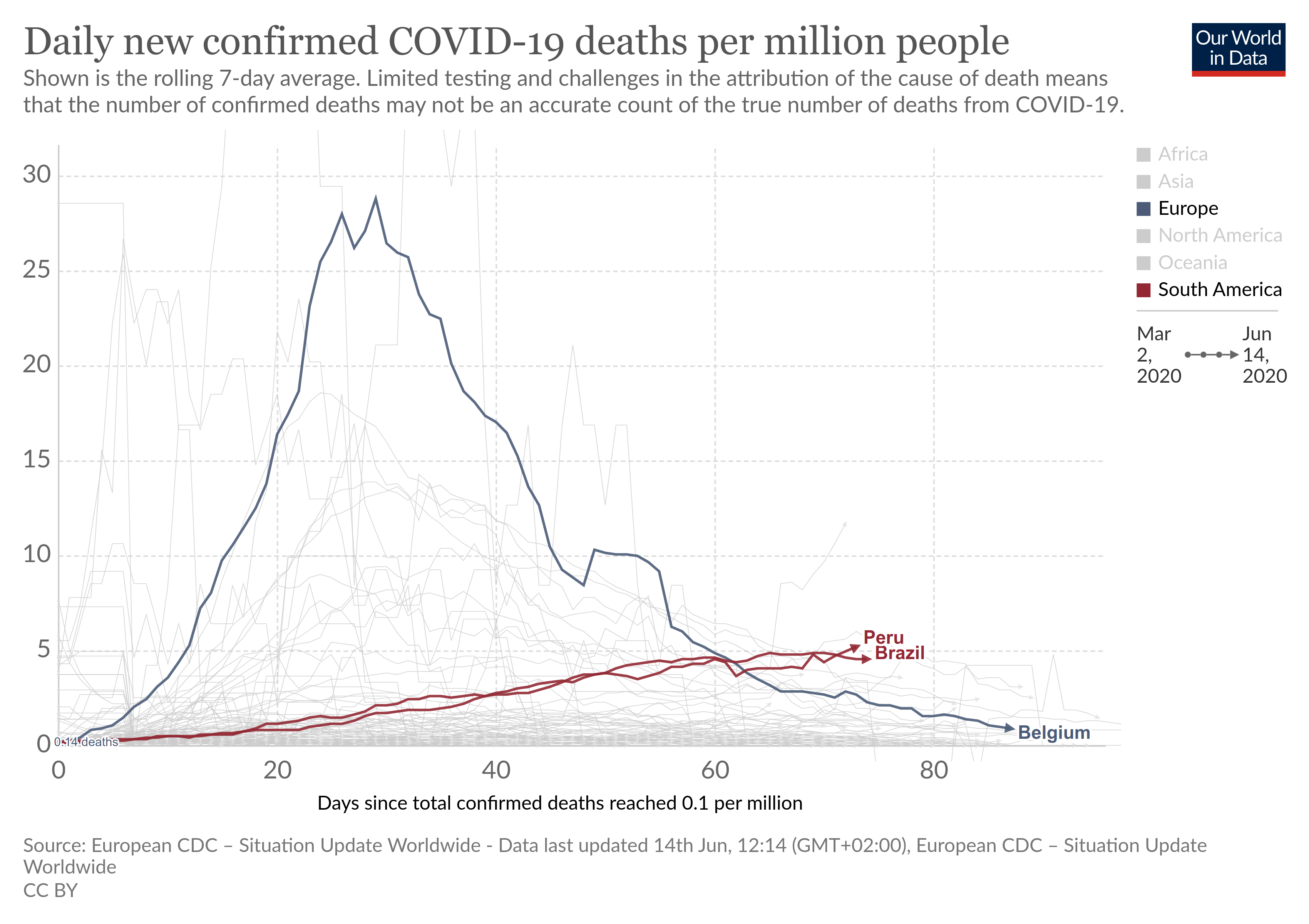 Vergelijk Brazilie (geen lockdown) met Peru (strenge lockdown). Je merkt op dat Brazilie (en Peru) heel langzaam naar een ombuigen gaan. Veel trager dan bij ons. Veel kleinere waarden dan bij ons. Veel meer afgevlakte curve. Maar vergelijkbaar verloop, met uitgerokken tijdsas (dus "vertraagd"). Het zou mij niet verwonderen dat dat komt omdat wij in een gunstig klimaatsverloop zaten (van winter naar zomer) en zij in een slecht verloop (van zomer naar winter). Ik heb voor de vergelijking, Belgie erbij gezet ook... Laatst gewijzigd door patrickve : 15 juni 2020 om 11:02. |