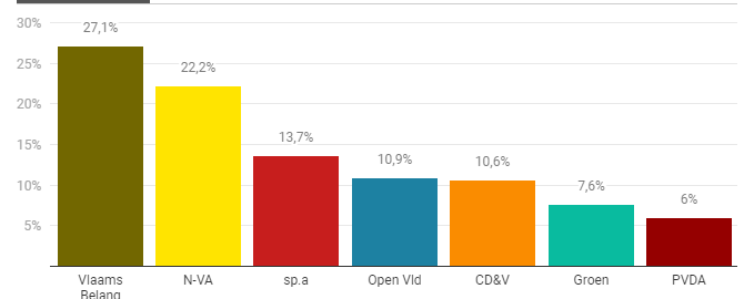 |   Alleen de SPA kiezers belonen hun partij. Begrijpelijk, het is de enige partij waar zich geen drama's hebben afgespeeld. Groen heeft Calvo ritueel geslacht. Open vld heeft Rutten opzijgezet voor vrouwvriendelijke en fiscale fraude expert De Croo. Die is zich nu al aan het voorbereiden om een vermogenswinst belasting te slikken. CD&V is zoals steeds de vis noch vlees partij die zich ging vasthouden aan een Vlaamse meerderheid. Zet die trend zich door dan gaan de elfjes problemen krijgen. En zoals ik al eerder aangaf is groen de eerste om te flirten met de kiesdrempel. |