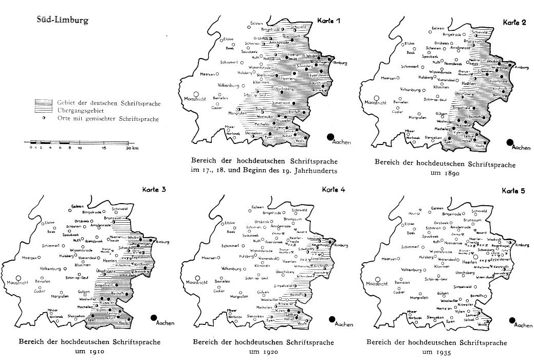 De doorluchtige heer Koenaard Depuydt dient met "U" aangesproken te worden en dus niet met "gij" of "ge". Hij heeft trouwens het bijzondere geluk om water van de kraan te kunnen tappen. Bijgevolg voelt hij niet de noodzaak om "iets te gaan drinken" in het "baanhof" (spoorhof) te As (Asch-en-Campine). Er zijn heel wat andere voorbeelden waarbij ofwel de oude ofwel de hedendaagse spelling van enkele Zuid-Nederlandse ofte West-Limburgse nederzettingsnamen Hoogduitse invloed vertonen. Waar nodig wordt de rein Hoogduitse wijze tussen haakjes vermeld. De rein Nederlandstalige wijze verschijnt daarentegen na het gelijkheidsteken. Boorsheim = Boorsem Reckheim = Rekem Koninxheim (Königsheim) = Koninksem Mall = Mal Stockheim = Stokkem Weyer (Weier) = Wijer Aldeneik (Alteneich) = Oudeneik Alt-Hoeselt (Althauselt) = Oud-Hoeselt Kessenich = Kessenik Mulheim = Mullem Obsinnich = Opzinnik Waltwilder (Waldweiler) = Woudwilder Dit verschijnsel komt duidelijker tot uiting in Noord-Nederlands ofte Oost-Limburg. Altweerterheide = Oudweertheide Belfeld = Belveld Bocholtz (Bocholz) = Boekhout Einighausen = Einikhuizen (Einickhuysen) Heijenrath (Heienrath) = Heienrade Mesch (Waals: Mexhawe) = Mes Ronkenstein = Ronkensteen Spekholzerheide (Speckholzerheide) = Spekhoutheide Stein = Steen Ubach over Worms (Ubach über Worms) = Ubeek ... Wahlwiller (Wahlweiler) = Waalwiller of Waalwilder Waubach = Woubeek Ysselsteyn (Ysselstein) = IJselsteen Dit is geheel niet verwonderlijk omdat de Hoogduitse taal aldaar daadwerkelijk gebezigd werd. Op de onderstaande afbeelding wordt de terugval van het Hoogduits in Noord-Nederlands Limburg aangetoond. ![]() Met Limburgse groeten