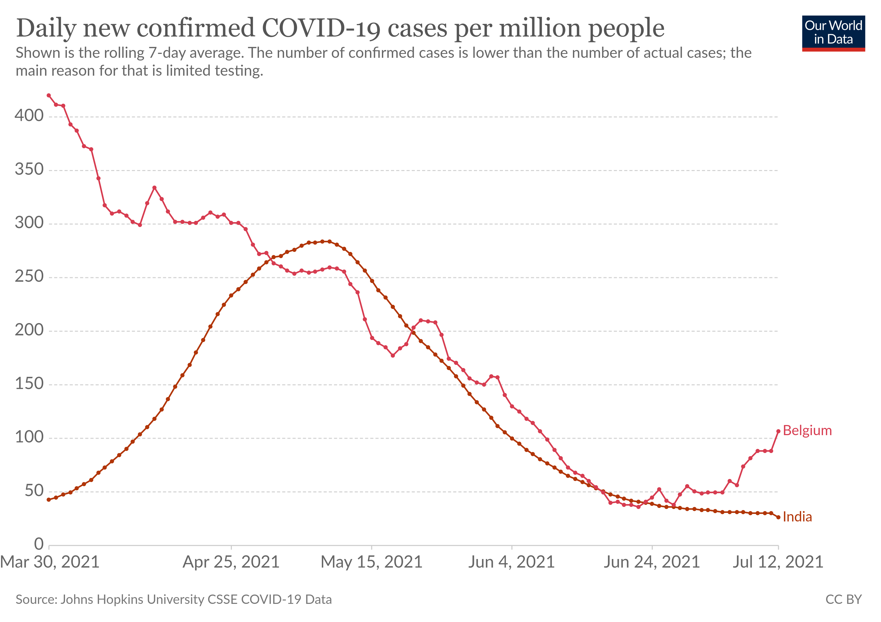 21 infections per 100K people reported last 7 days ter vergelijking: Belgie: 62 infections per 100K people reported last 7 days Nederland: 266 infections per 100K people reported last 7 days UK: 336 infections per 100K people reported last 7 days