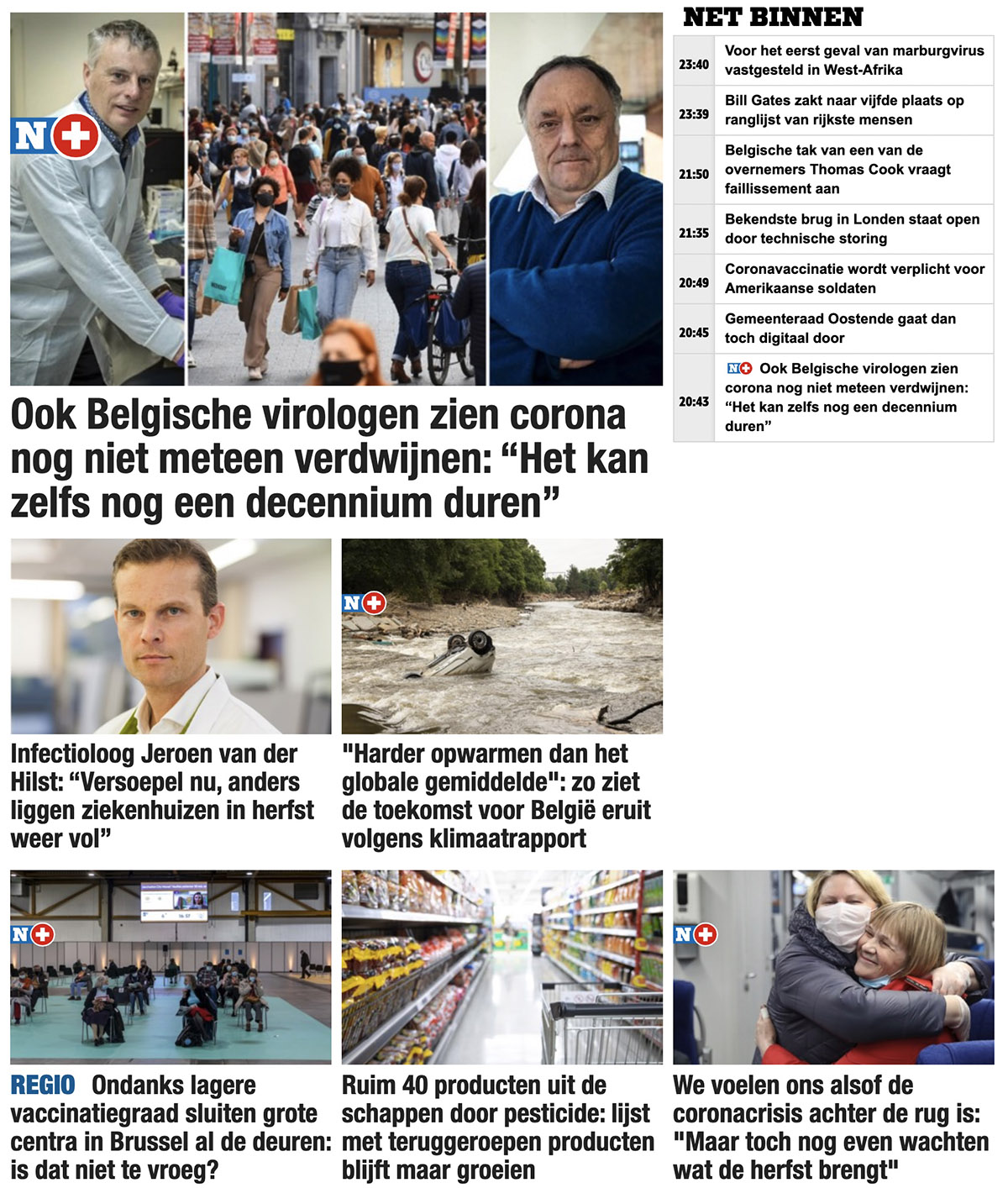 “Versoepel nu, anders liggen ziekenhuizen in herfst weer vol” https://www.nieuwsblad.be/cnt/dmf20210809_96167211 “Het kan zelfs nog een decennium duren” https://www.nieuwsblad.be/cnt/dmf20210809_96743635 “Maar toch nog even wachten wat de herfst brengt” https://www.nieuwsblad.be/cnt/dmf20210809_95050602 Laatst gewijzigd door Hoofdstraat : 9 augustus 2021 om 22:56. |