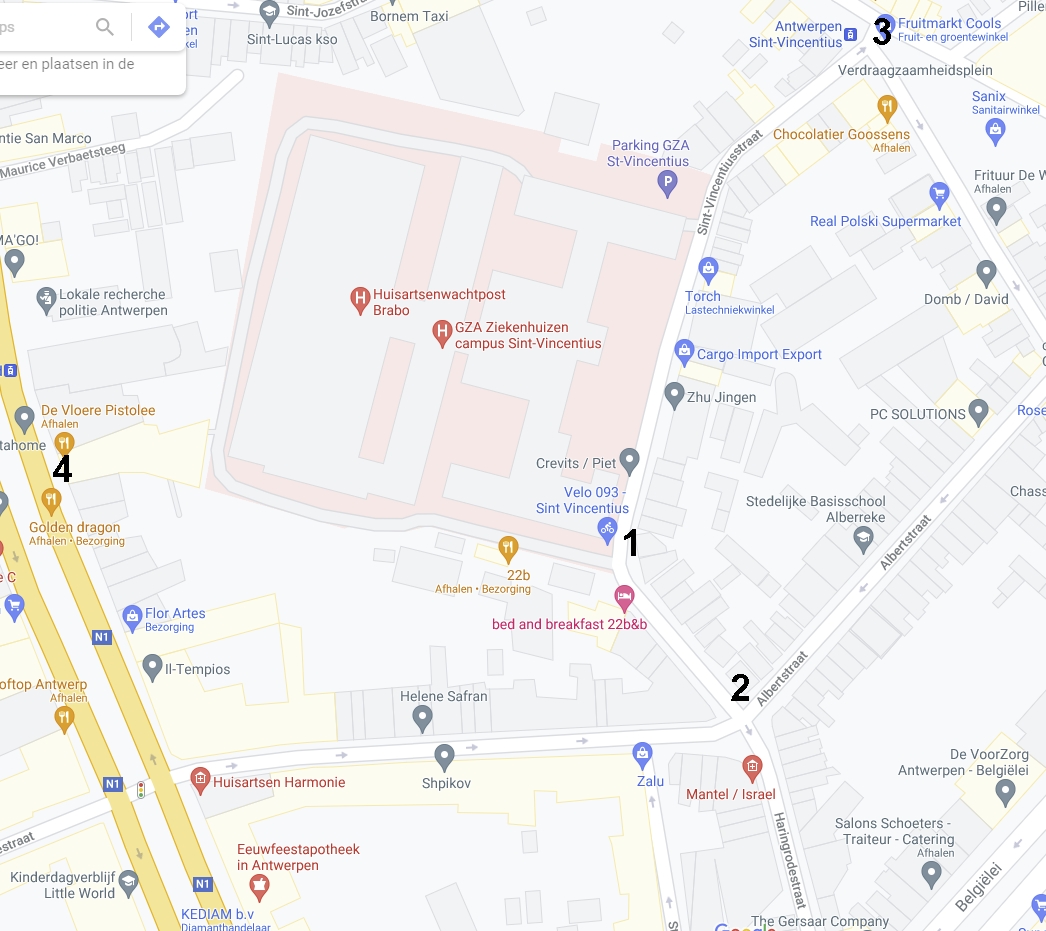 Het enkelrichtingsverkeer in de St Vincentiusstraat geldt niet voor het begin van de St Vincentiusstraat maar eerst vanaf de ingang van de parking. De bezoekers van de parking worden bij de uitgang wel richting Lange Leemstraat gestuurd. Het stuk dubbele richting is ongebruikelijk en heeft men blijkbaar voor het gemak van de hulpdiensten gepland. Trouwens via die richting komt men onvermijdelijk op de Belgiëlei uit. Vreemd want zonder de enkelrichting zou de St Thomasstraat een extra alternatief kunnen zijn voor de Lange Leemstraat voor ingrepen in het stadscentrum.