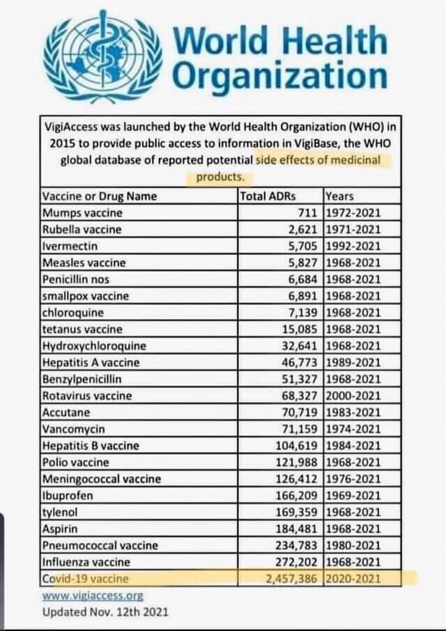 vastgestelde bijwerkingen per vaccin over de jaren dat het is toegediend: een vb : mazelen : +/- 6000 gevallen tussen 1968 en 2021 Covid : +/- 2.500.000 gevallen OP 1 JAAR