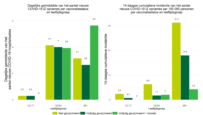 Kijk bijvoorbeeld naar de ongevaccineerde actieven: dat zijn 4.1 opnames per dag. Dat wordt omgerekend naar een incidentie van 6.3 op 14 dagen per 100 000 niet-gevaccineerde actieven.