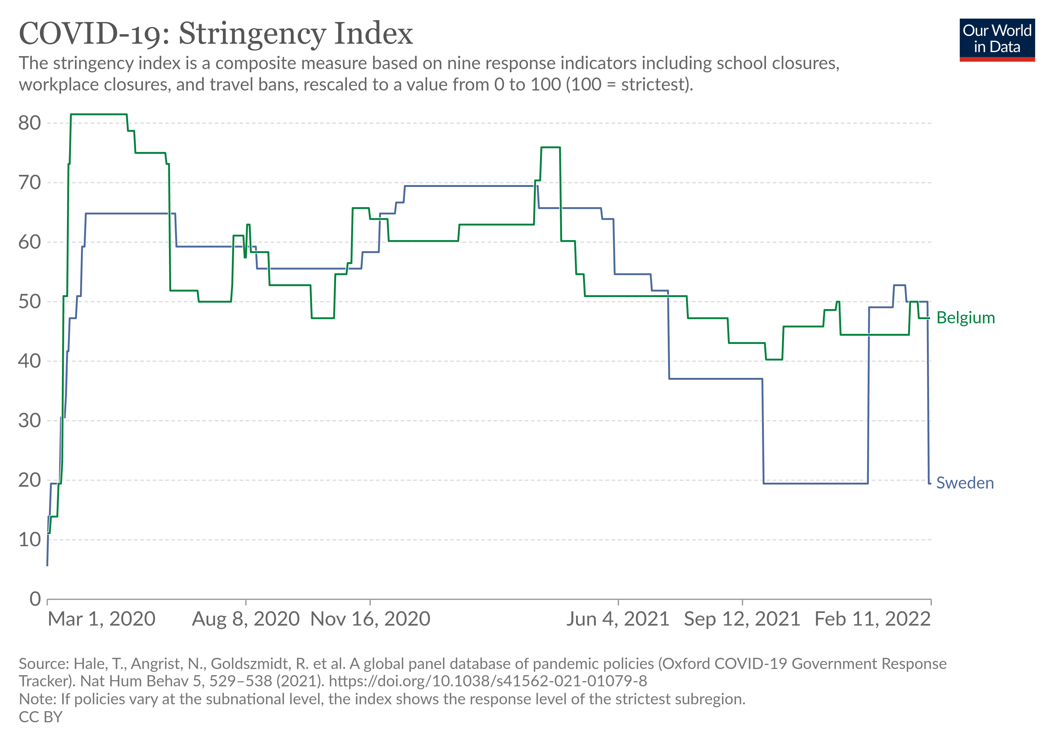 https://www.bmj.com/content/375/bmj.n3081 Tegnell was among those insistent that the lockdowns imposed by other countries were excessive. Compared with other major European countries the number of overall cases and deaths in Sweden was low—just under 93?000 cases and 6000 deaths by 1 October 2020 compared with over 118?000 cases and 10?000 deaths in Belgium, which has a similar overall population size, or the 606?000 cases and 32?000 deaths seen in France and other larger countries, according to Our World in Data. But by winter 2020 a second wave with the new alpha variant brought a spike in cases.2 In the six months between October 2020 and March 2021, the country saw 657?309 positive cases and 12?826 deaths.