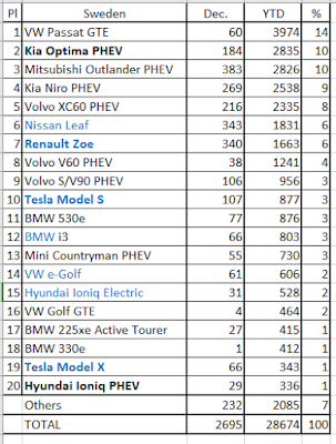 In een uitgestrekt land met (nog) relatief weinig (snelle) laadpunten werden verleden jaar vooral plug-in-hybrides verkocht. De eerste 5 waren altijd hybrides, zoals in jaartabel 2018 nog te zien. http://ev-sales.blogspot.com/2019/01...mber-2018.html Daar komt nu langzaam verandering in door het Tesla model 3 en de modellen met grote batterijen, het laadnetwerk zal ook langzaam groter geworden zijn. Tesla zal daar geen of minder problemen hebben met zijn Suc- en destination-laadpalen. Model 3 staat nu zelfs tweede, en zelfs het model S doet een relatieve revival met 90 verkochte wagens in april en klimt naar de 14e plaats (stijgt verrassend 3 plaatsen tov maart!). Als model S zo verder doet kan het zelfs 2018 evenaren. De Audi e tron haalt daar nipt 20e plaats dankzij 43 verkochte wagens in april. Het model 3 sluipt met 1.451 stuks zelfs het ICE lijstje binnen van de middenklasse op de 4e plaats voor al de BMW 3-series. EV-Sales ziet voor Tesla m3 en de opgefriste model S (extra range, en basismodel is terug) nog verder groeipotentieel in de middenklasse en hogere segmenten van de premiumklasse van Audi A4-A5-A6, ook BMW 5 en Mercedes E-klasse. Citaat: