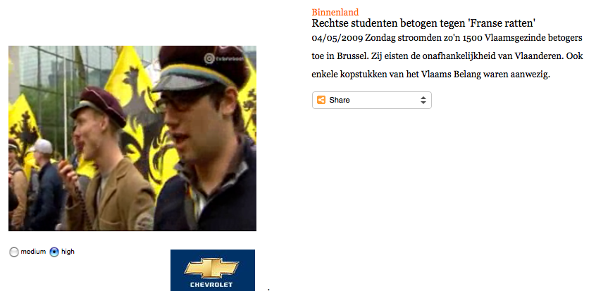 ![]() Rechtse studenten betogen tegen 'Franse ratten' Zondag stroomden zo'n 1500 Vlaamsgezinde betogers toe in Brussel. Zij eisten de onafhankelijkheid van Vlaanderen. Ook enkele kopstukken van het Vlaams Belang waren aanwezig. bron + video : De Standaard Online - In Beeld - Binnenland | 04/05/2009 http://www.standaard.be/video/videoP...videoId=238274 ps : Persoonlijk beschouw ik de door KVHV gebruikte slogan "Franse ratten, rolt uw matten" als een racistische en haat oproepende slogan. De verschillende organisaties van de Vlaamse Beweging zijn er altijd als de kippen bij om verontwaardigde persverklaringen de wereld in te sturen als Olivier Maingain of een andere franstalige politicus één of andere hatelijkheid tegenover de Vlamingen rondbazuint maar zwijgen spijtig genoeg als vermoord wanneer uit Vlaams-nationale kringen identieke hatelijkheden worden verkondigd. Dit is niet mijn Vlaamse Beweging (meer). Welke flamingantische organisatie durft deze omerta te doorbreken ? Laatst gewijzigd door Hendrik de Stoute : 4 mei 2009 om 14:49. |