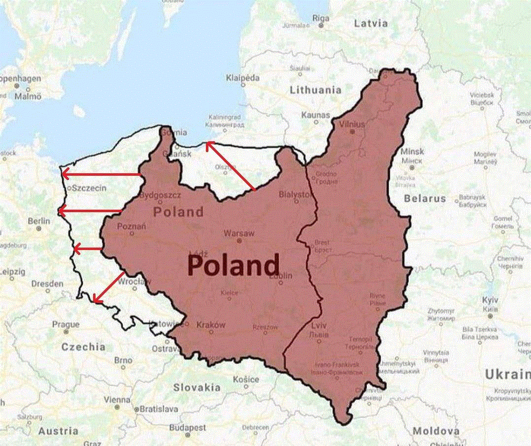 https://t.me/berichten_uit_Donbass/11915 (Engelstalige ondertiteling) In onderstaande figuur enige context, met name de grenzen van Polen voor de tweede wereldoorlog en de grenzen na WO-II. Zoals u zult kunnen opmerken is het land ongeveer even groot gebleven maar zijn de grenzen opgeschoven. (fig.)