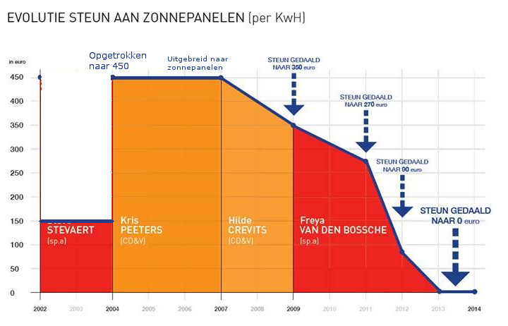 1. Aangezien de prijs van zonnepanelen bleef dalen en de subsidies gelijk, was het zeer interessant om te wachten tot het optimaal punt om te investeren. Veel grote spelers hebben vlak voor de subsidies zakten nog een paar 'parkskes' gelegd. Dat zou onder élke minister gebeurd zijn. 2. Toen Freya die subsidies was aan het terugdraaien hebben OVLD en Groen daartegen geprotesteerd vanuit de oppositie, want "dat zou de doodsteek zijn voor de werkgelegenheid in de sector" 3. Toen bleek dat de nieuwe regelgeving te laat klaar was kon dat wel nog via een versnelde procedure worden ingeschreven in de programmawet. Het was Peumans van de NVA die als parlementsvoorzitter het omvormen van de regelgeving nog een half jaar heeft uitgesteld omdat "niet was aangetoond dat dat een belangrijke budgettaire impact zou hebben" Citaat: