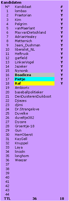 Kunnen wij eens een lijstje krijgen met de namen op de kandidatenlijst, er zijn namelijk al zoveel draden geweest dat het een beetje onoverzichtelijk wordt...