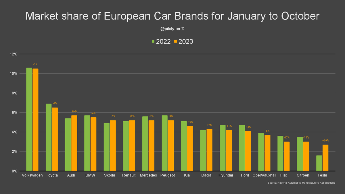 Nog altijd geen Europees merk die - betreft BEV - ernstig concurreert met Tesla. De eerste achtervolger - wereldwijd - is BYD, die is zelfs genaderd op Tesla. In Europa an sich verliezen 11 van de beste 16 merken marktaandeel in de 10 maanden 2023: (alle soorten brandstoffen) De 5 merken (van die 16) die hun marktaandeel verhoogden: 1. Audi: +6% 2. Skoda: +6% 3. Renault: +2% 4. Dacia: +2% 5. Tesla: +69% (moest daarvoor 100% meer wagens verkopen YTD, onderste grafiek, top 20 ) Citaat: