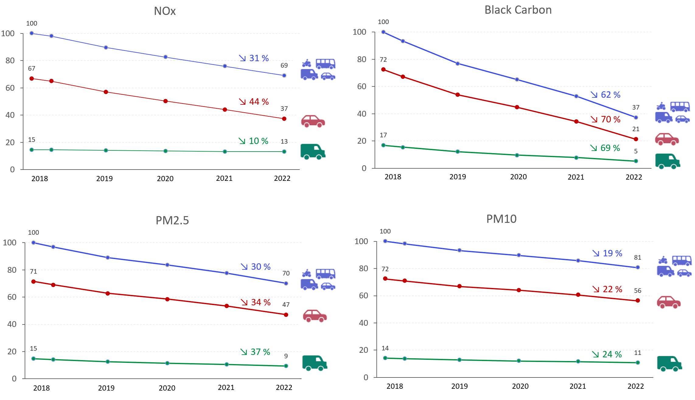 >> De evolutie van bepaalde voertuigemissies (1e grafiek onderaan, rood = personenwagen), ondanks toegenomen verkeer (denk ik ![]() • Hoe fijner de roetdeeltjes hoe meer de afname: zie Black Carbon tot -70%, ook PM 2,5 tot -34%. • De grotere roetdeeltjes zoals PM10 (-22%) komen eerder zelden uit de voertuiguitlaat (wel remstof en bandenslijtage). Dan moet de motor al een defect hebben... • NOx - 44% is ook geen goede parameter bij voertuigen, ook omdat dit vooral dieselmotoren betreft. - In elk geval zijn er veel Brusselaars en de stadsbezoekers/bedrijfswagens/pendelaars omgestegen op modernere benzinevoertuigen en/of nog betere alternatieven (>10%). Die tekst en grafiek moet ik nog proberen vinden en plakken (want hier klikt sowieso bijna niemand een ellenlange link aan) bron: Citaat: