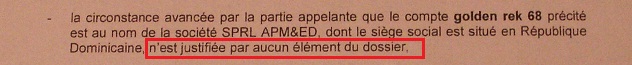 Wat doe je als je gegevens wil van een Argenta GOLDENREKENING-68 die naar alle waarschijnlijkheid is gelinkt met APM&ed bvba met het ondernemersnummer 0474 014 947? Wel, zou het niet helpen om deze gegevens gewoon te vragen? Het telefoonnummer van de hoofdzetel van Argenta is snel gevonden, en op 4 november 2010, om 12.04 uur op precies te zijn krijgen we zonder enig probleem volgende gegevens: Het gaat om de GOLDEN REKENING met het nummer 949-2189838-68 op naam van APM&ed bvba – op dat ogenblik nog steeds in gebruik – op volgend adres: Autopista – Puerto Plata 42 – SOSUA – REPUBLICA DOMINICANA. We sturen deze gegevens onmiddellijk door naar inspecteur Sebastien B. die pas enkele weken geleden ons bewaar heeft afgewezen met de bewering dat deze rekening op mijn naam MOEST staan … omdat … omdat … flut-excuus dus. Ik herhaal nog even dat tot op heden alle info aangaande deze rekening door de fiscus wordt genegeerd en ook niet wordt opgevraagd en of nagekeken. Even ter herinnering, dit denkt de rechter (maart 2013) in eerste aanleg van de gegevens die wij hebben doorgestuurd. Later zal ik tonen welke informatie er allemaal in de conclusies is opgenomen naar aanleiding van de procedure in eerste aanleg. Iedereen kan dan voor zichzelf uitmaken of het negeren van die informatie kan vallen onder een normaal denkpatroon. Naar mijn mening is het vrij abnormaal dat de gegevens van meerdere getuigen niet worden aanvaard op met als reden het ontbreken van enige informatie vanuit de fiscus. Toch merkwaardig dat tot op heden die fundamentele bankgegevens niet zijn nagetrokken? Laatst gewijzigd door Johan Daelemans : 2 december 2016 om 10:39. |