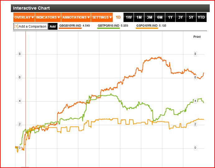 Tenzij ik iets fout doe (ben geen volleerd trader) lijkt het dat de afgelopen 24 uur we (België=rood - 10 jaar lening) percentueel wel een stuk harder gestegen zijn dan italië(groen) en Spanje(oranje)