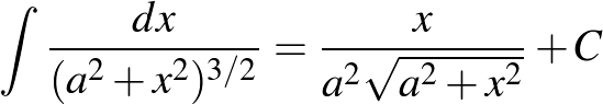 De substitutie die je doet is x = a tan u => dx = a/cos²u du en a²+x² = a² (1+tan²u) nu is sin²u + cos²u = 1 => tan²u + 1 = 1/cos²u => a²+x² = a² / cos²u DUS integraal wordt: integraal (a/cos²u) * (1/(a²/cos²u) ^(3/2)) * du integraal (a / cos²u) * (1/a³) * (1/(1/cos³u)) * du integraal (1/a²) * (1/cos²u) * cos³u du 1/a² integraal (cos u du) 1/a² sin u Nu is x = a tan u ==> sin u / cos u = x/a ==> sin u = x / (x²+a²)^(1/2) (cosinus van een boogtangens formule) ==> 1/a² * sin u = 1/a² * x / wortel (x²+a²) 'k Heb het nog eens afgeleid en ik kom toch weer tot de oorspronkelijke functie