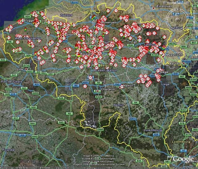 ![]() Ik gok eerlijk gezegd dat de kaart door Vlamingen is samengesteld of ingesteld staat op Vlaanderen. De onderstaande kaart vind ik ook via uw zoekopdracht, daar is op te zien dat er belachelijk veel flitspalen staan in ons drukbevolkte gebiedje, maar een compleet gebrek eraan in Wallonië zie ik niet.