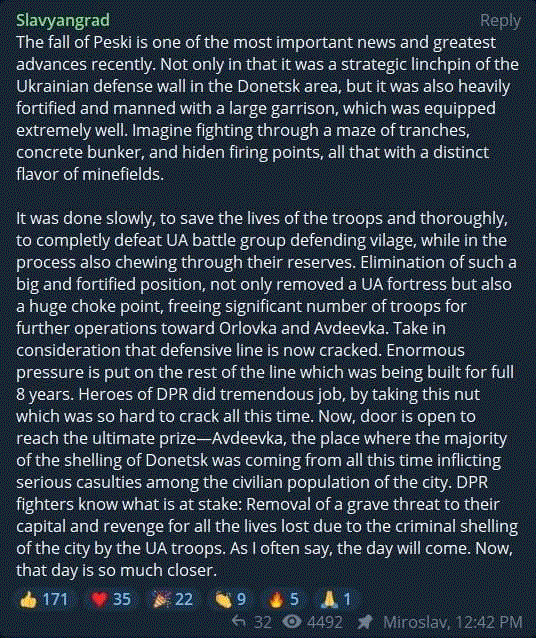 Als men Donetsk wil veiligstellen moet men Avdiivka veroveren en dat wordt de taaiste brok: eigenlijk moeten ze die stad eerst voor 3/4 omsingeld hebben en zelf dan wordt het loodzwaar. Daar waar Bakhmut de logistieke hub is/was, is Avdiivka het sterkst bepantserd net omwille van het feit dat het vlak naast Donetsk ligt. De enige manier om dat te doen lijkt mij om de stad Ocheretyne te veroveren omdat je daar de spoorlijn en de belangrijke verbindingsweg kan blokkeren en er zo een Mariupol-scenario van maken (maar zelf dan zal het dus loodzwaar zijn, gezien je door die laatste linie moet breken die voor Avdiivka, New York, en Torretsk loopt. Citaat: