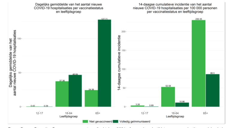 Laten we eens een oud rapport opduikelen van sciensano. Bijvoorbeeld van 3 december 2021 (volop in de delta golf). http://covid-19.sciensano.be/sites/d...3%20-%20NL.pdf Daar zie je (rechterkant van de grafiekjes) dat de fracties besmetten door covid bij de gevaccineerden en ongevaccineerden ongeveer dezelfde zijn bij de volwassenen. Dus evenveel gevaccineerden als ongevaccineerden doen covid op. Maar we zien dat er bij de actieven de fractie die naar het ziekenhuis moet 5 keer kleiner is bij de gevaccineerden dan bij de ongevaccineerden (52 vs 11), en bij de bejaarden is dat een kleine factor 3 (230 vs 86). We zien ook dat bij de actieven, de fractie op intensieve zorg 6 keer kleiner is bij de gevaccineerden dan bij de ongevaccineerden, en bij de bejaarden is dat een kleine factor 5. Dat geeft redelijk duidelijk de beschermingsfactor aan van het vaccin tegen ziekenhuis opname en tegen IZ opname. In december begon er al goed sleet op te komen, maar de bescherming was toch nog vrij duidelijk. | |