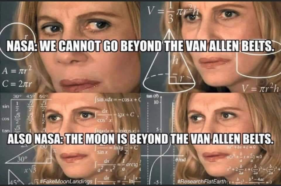 ![]() Een nasa kwiebus zegt dat er mogelijke "gevaren" zijn bij het doorkruisen van de Van Allen gordels. Een nasa kwiebus die wel iets moet zeggen waarom het project waarop ze werken traagskes vooruit gaat. En zichzelf wat belangrijk maken. Zoals het gevaarlijk is om zonder een valhelm te fietsen of zo. En daaruit besluit je dat het onmogelijk is dat er mensen ooit met een fiets gereden hebben, want misschien geen valhelm.