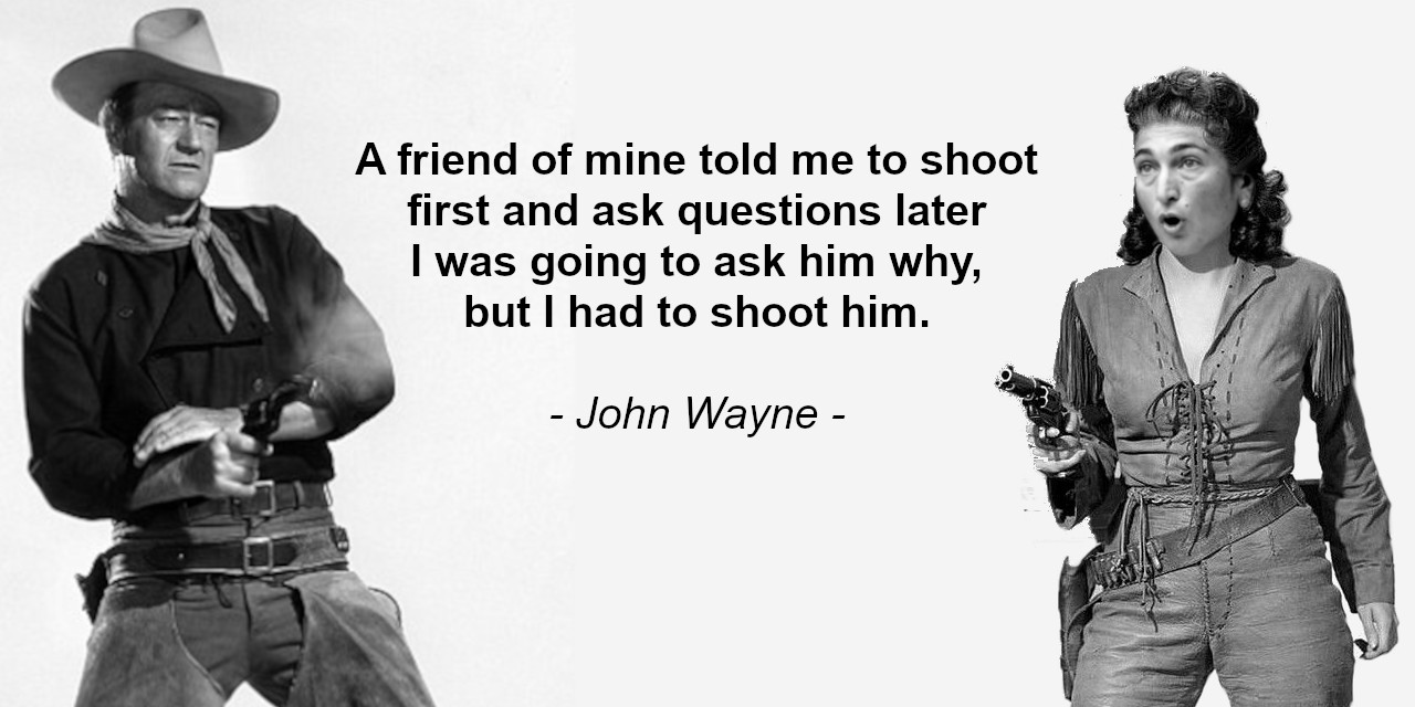 ![]() De befaamde uitdrukking van John Wayne. Ik had hem afgelopen maandag al gepost maar hij werd verwijderd. Het is nochtans exact wat Zulma gedaan heeft. Twee dagen nadat ik het gepost had, omschreef ook Gwendolyne Rutten op de Afspraak 'een Zuhalleke doen' als uit de heup schieten'. John Wayne schoot altijd uit de heup en daarom dat ik die meme gepost had. Als Gwendolyne het mag dan mag ik het ook. Bij deze...