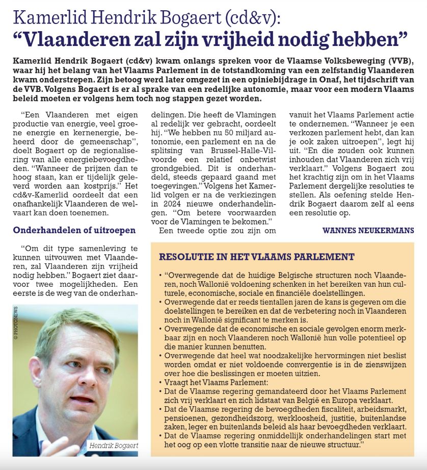 Na N-VA en VB roept nu ook Hendrik Bogaert (CD&V) op de Vlaamse onafhankelijkheid uit te roepen in het Vlaams Parlement.