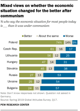 Ja maar, wat meen je te kunnen lezen in die data? Wat hoop je daar uit op te maken?: dat die mensen terug communisme zouden willen? Dat kan je helemaal niet concluderen. Dat is uw interpretatie, maar dat was helemaal de vraag niet die werd gesteld aan de respondenten! Wat werd er gevraagd?: "is de economische situatie vandaag beter dan onder het communisme?" Dat is een vraag naar de eigen beleving van de economische situatie. Een subjectieve beleving dan nog! Er wordt helemaal niet gevraagd of ze communisme willen! Welnu, als je puur de GDP data van 1989-2005 bekijkt dan zie je dat het +/-15j heeft geduurd eer de economie op hetzelfde niveau stond als voor de val: https://ourworldindata.org/grapher/g...GR~LVA~HUN~UKR Dan is het niet zo onlogisch dat mensen daar zo op antwoorden. Bovendien is er ook de "vroeg was het beter" reflex (ongeacht waar je woont), dus wat ben je daar dan mee? Als je kijkt naar de survey's die gericht peilen naar de transitie van communisme naar democratie/marktwerking, dan is die WEL overwegend positief. Overal. Dit is een oude survey, van 2009, dus nog voor alle shit in Oekraine: https://www.pewresearch.org/global/2...-reservations/ De resultaten spreken voor zich.