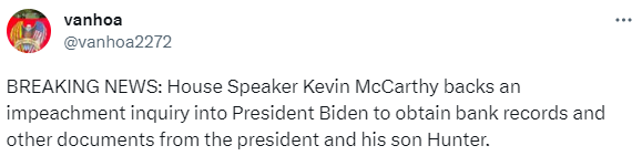 Nieuws van twee uur geleden: de bankuittreksels (en andere documenten) die te maken hebben met de mogelijke misdrijven van Joe en Hunter Biden in Oekraïne gaan opgevraagd worden. De voorzitter van het Huis van Afgevaardigden, het equivalent van de Kamer van volksvertegenwoordigers, ondersteunt het onderzoek.