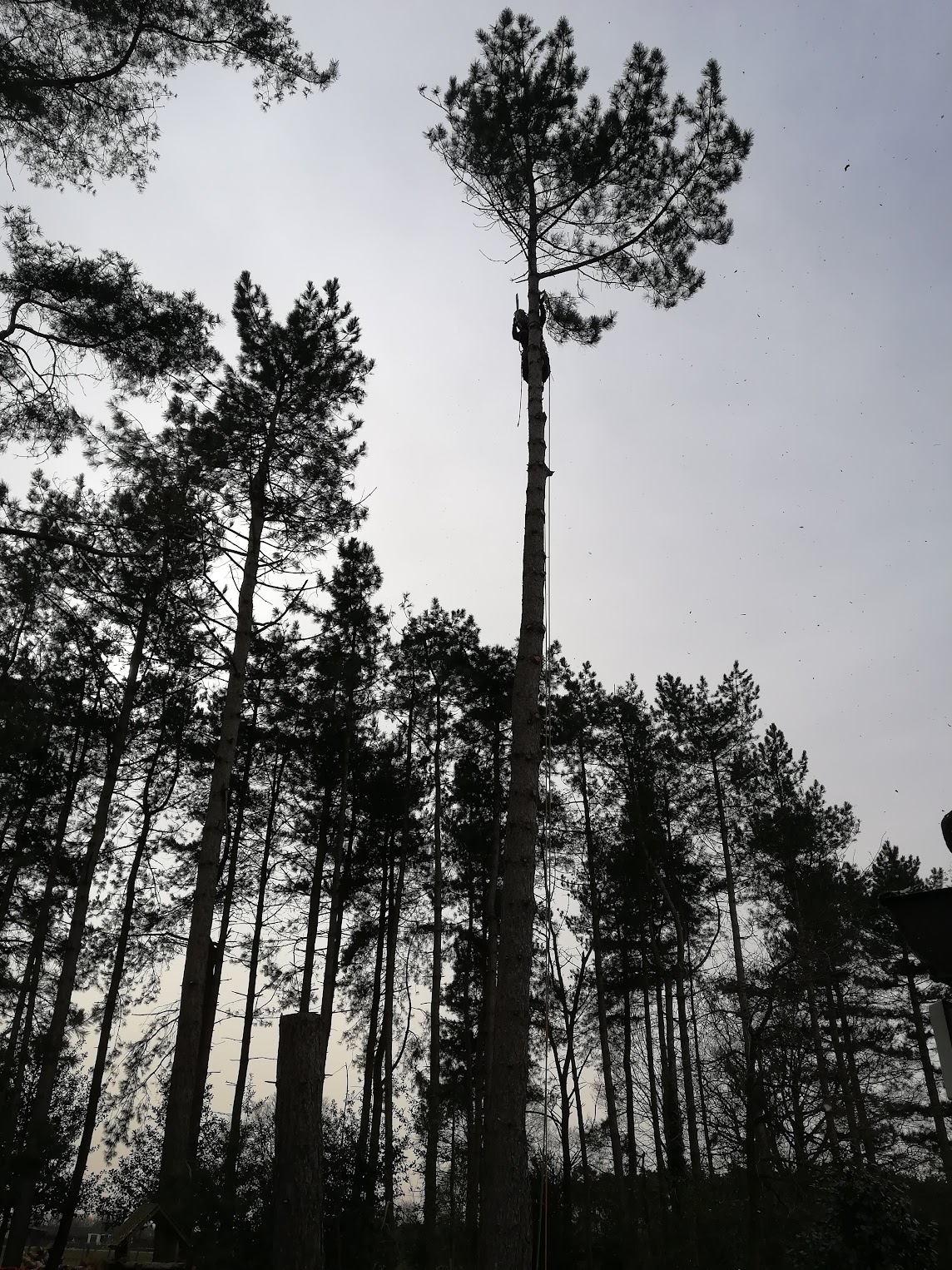In uw knotwilgen kruipen? Zie 2 fotos uit ons bosje met een kapvergunning van 12 dennen. Nee, die gaat echt niet met een electrische kettingzaag van boven (+20 meter) naar beneden, takken en blokken zagen...