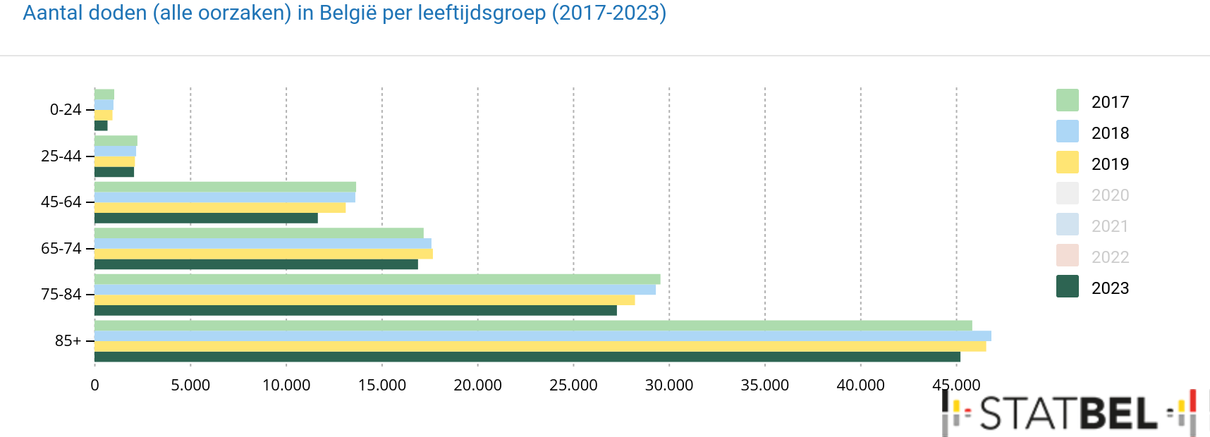 https://statbel.fgov.be/nl/over-stat...es/mortaliteit De mortaliteit in Belgie in 2023 loopt heel gelijk aan die van voor corona. Ik heb de corona jaren weggelaten. Laatst gewijzigd door patrickve : 31 december 2023 om 15:14. |
