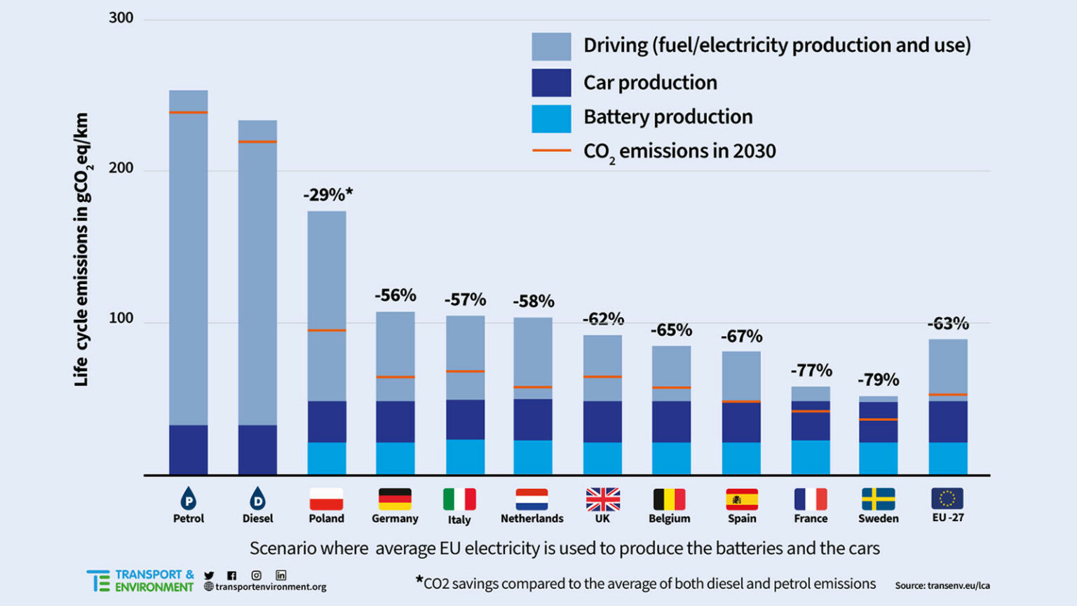 Wie had het enkel over milieu (auto's an sich)? Je bedoelt CO2-equivalent? Voorlopig (2021 data, bijlage) met EU-27-gemiddelde is het reeds 63% minder CO2, levenscyclus hé; en de berekening 2030 is ook al gemaakt, dan is het ca. -77% of -80%, zelfs de plofwagens worden iets zuiniger, zie rood lijntje op balkjes benzine en diesel in bijlage. (In de 2017 studie was het EU-28 gemiddelde vermindering 55%) 2022 : https://e-drivers.com/elektrisch-aut...ok-minder-co2/ In dit tool kan men zijn nieuwe plofwagen vergelijken met een nieuwe BEV in hetzelfde segment, naargelang diverse parameters: Citaat: