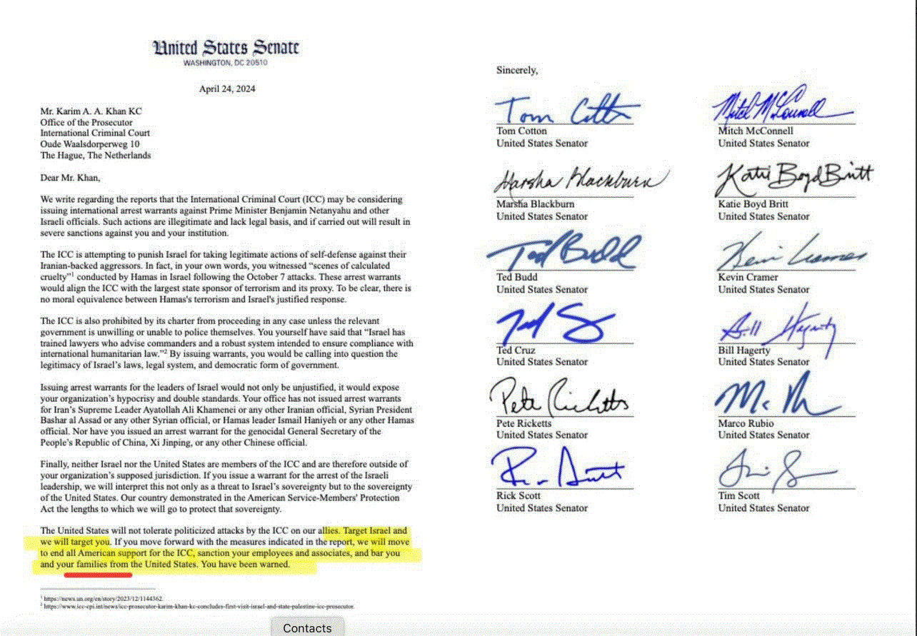 Onderstaande 12 Amerikaanse senatoren moeten door het ICC aangeklaagd worden wegens medeplichtigheid aan genocide. Ze schreven een brief gericht aan het ICC en waarin ze de leden van het Hof persoonlijk bedreigen in het uitoefenen van hun taken.