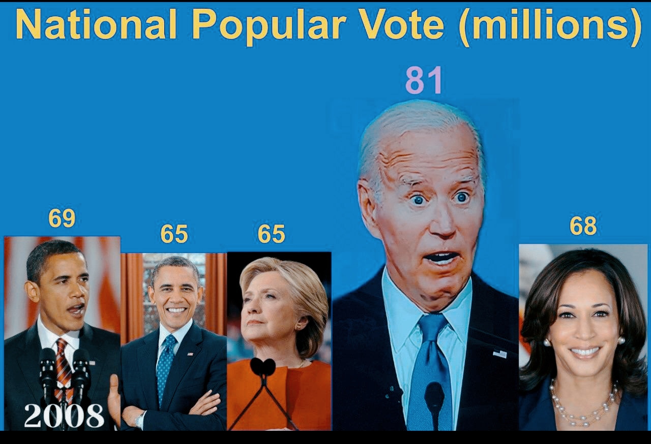 https://edition.cnn.com/election/202...emaining=false Hieronder zie je telkens de winnende partij, hun stemmen, en het verschil. Door dit vershil af te trekken van het dubbele kom je uit op het totaal uitgebrachte stemmen. Dat leidt er ons toe dat het aantal 'uitgebrachte' stemmen bedroeg in het jaartal: 2004: 121.069.054 Bush 2008: 128.846.839 Obama 2012: 126.849.299 Obama 2016: 123.100.970 Trump 2020: 155.507.476 Biden 2024: 142.896.238 Trump https://en.wikipedia.org/wiki/List_o...ar_vote_margin Simpele vraagjes: - Welke verklaring geef je er aan dat in 2016 er plotsklaps 12M meer stemmen gegeven werden aan een seniele Biden dan aan een toen al populaire Trump? - Hoe komt het dat er slechts één uitspringer is in een curve die normaalgezien een geleidelijke stijging zou moeten doorzetten? - Hoe komt het dat er op dit moment 12M minder democratische stemmers zijn terwijl die gigantische sprong niet aan de andere kant te merken is? Oftewel: