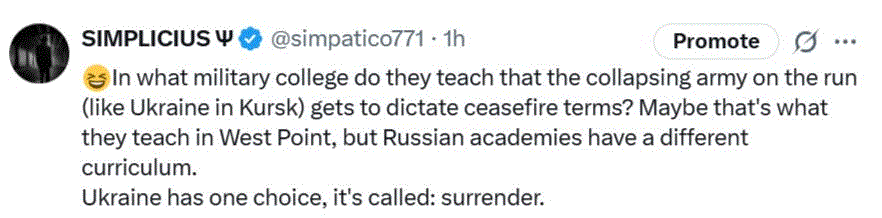 ![]() De Amerikanen willen Rusland nu met veel show en theater dwingen tot een staakt-het-vuren. Men laat het overkomen dat Rusland beschaamd zou moeten zijn indien het daar niet op ingaat, maar wat heeft Rusland daaraan? De Kursk oblast staat op het punt volledig ontzet te worden. Bij benadering 70.000 manschappen van 404 zijn er verwezen naar de eeuwige jachtvelden. De basisoorzaken van het conflict moeten aangepakt worden. Dat is wat Rusland wil. Indivisible security. Balance of power. Dat soort zaken. Daar moet het naartoe.