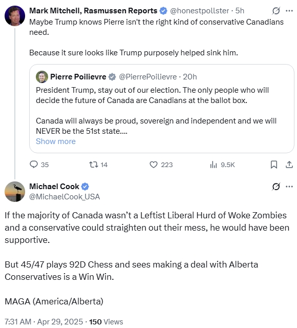 MAGA-cope die ik vanmorgen op Twitter ben tegengekomen is dat deze uitslag conservatieve staten als Alberta, Saskatchewan, en Manitoba zal aanzetten zich van Canada af te scheiden en zich bij de VS te voegen. Random voorbeeld: