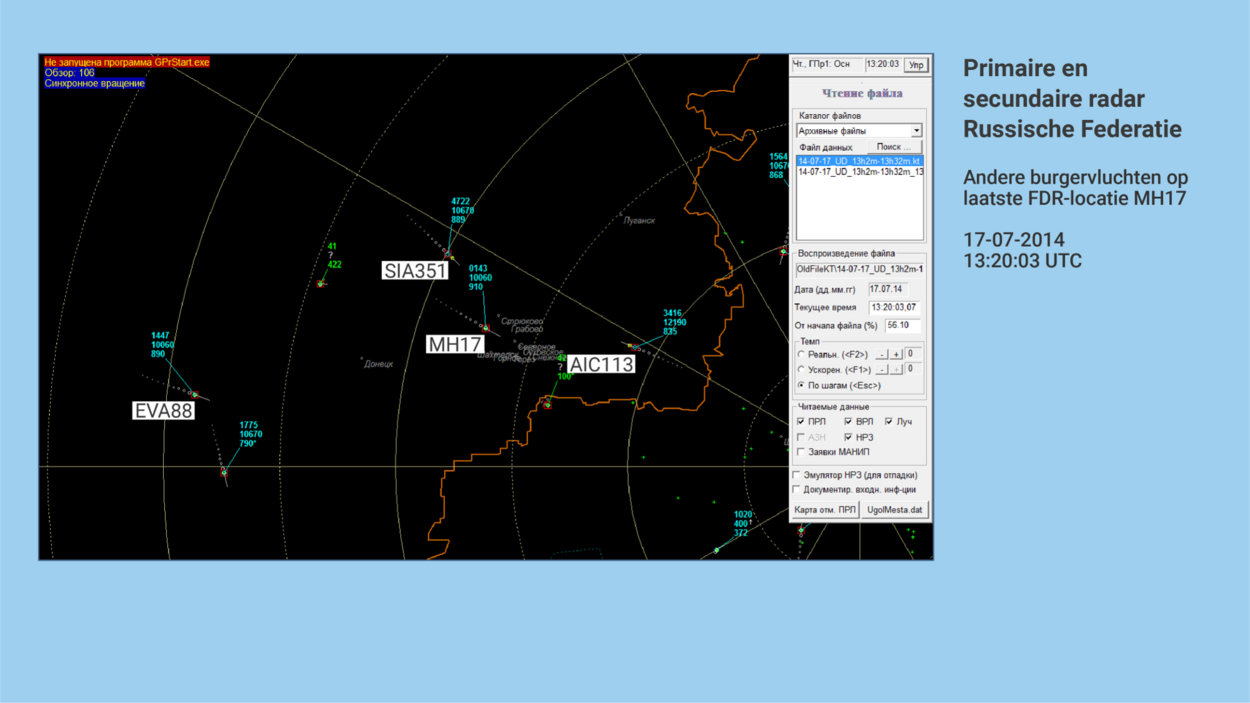 De Russische primaire data zijn besproken door de Russische wapenfabrikant Almaz Antey en het Russische Ministerie van Defensie op 26 en 28 september 2016 en beoordeeld door de twee genoemde deskundigen die door de rechter-commissaris zijn benoemd. Eerder heeft de Onderzoeksraad voor Veiligheid een video-opname geanalyseerd van de primaire radarbeelden van hetzelfde radarstation.