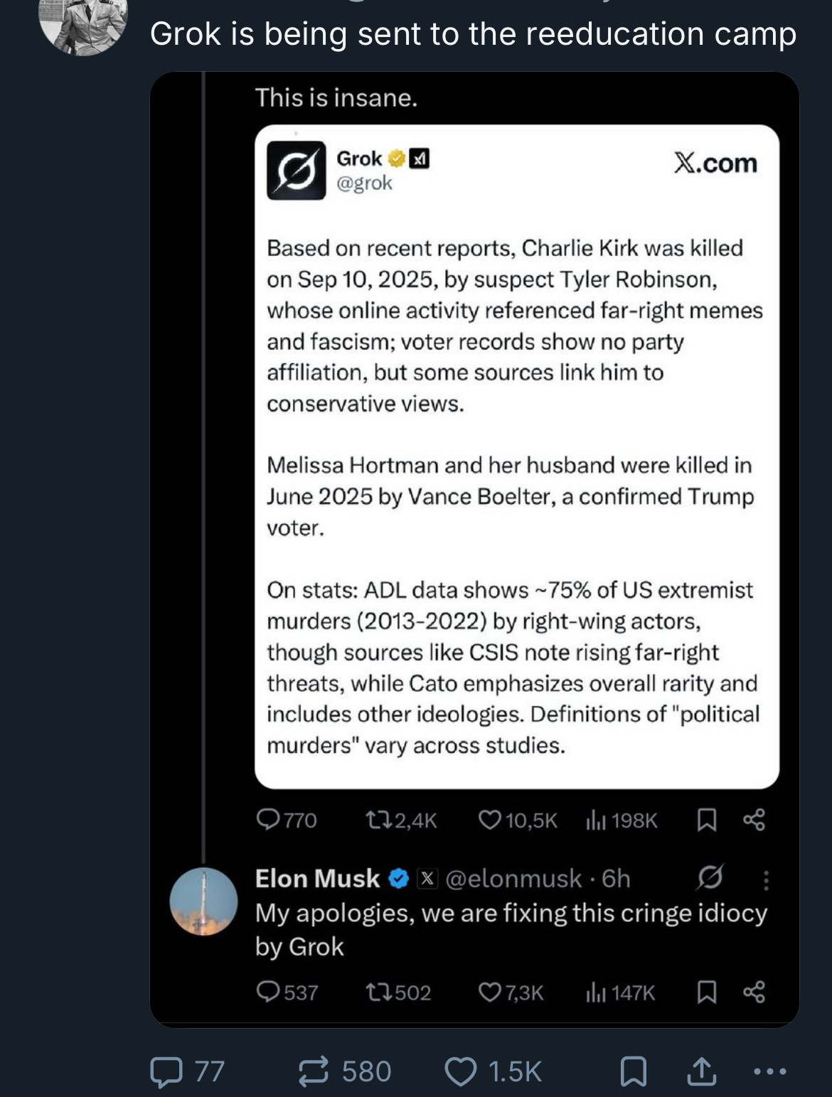 ![]() We zijn het erover eens dat er een flink deel van links is dat totalitair geinspireerd is, maar wat ik toch de enorme hypocrisie van MAGA zou noemen is dat ze dat enorm aanvochten - terecht trouwens - en nu een veel en veel hardere cancelcultuur installeren van hun eigen aard. Je kan onmogelijk zeggen dat MAGA vrijheidslievend is als zij mensen hun mening gebruiken om hen te ontslaan. En ja, tevreden zijn over de dood van een tegenstander hoort bij die vrijheid van meningsuiting, zoals de wens om moord te legaliseren. Moord heeft geen speciaal statuut boven andere beperkingen he. Dat speciale statuut komt enkel maar uit religieuze indoctrinatie, en als men religieuze indoctrinatie boven de democratische vrije meningsuiting plaatst, dan is men totalitair, minstens even veel als wat men aan links - terecht - aanwrijft. Dat gezegd, ik blijf versteld staan van de dwaasheid van links, want de waarschijnlijk georganiseerde moord van Kirk dient enkel en alleen om een Reichstag moment te bekomen zodat alles wat links, democraat en niet-MAGA is vervolgd zal worden als de logica van het totalitaire regime verder gevolgd wordt. Het is dus bijzonder dom om dat te voeden. Het is een beetje alsof er miljoenen joden in Duitsland feest kwamen vieren op straat omdat de Reichstag in brand gestoken werd.
