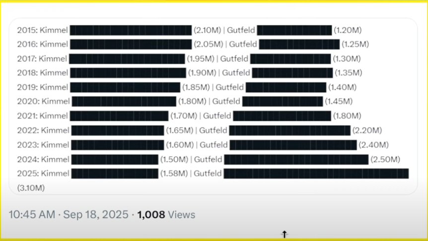 DAT is wat ik bedoel met die statistische signatuur. Er waren dus 1000 dagen om die Kimmel te ontslaan omwille van zijn slechte prestaties, en 3 of 4 dagen om dat te doen om censuur redenen. Blam, het viel "toevallig" op die censuur reden dagen, maar natuurlijk was het niet omwille van censuur zulle. Dat is 99,7% kans dat het om censuur ging, en 0.3% kans dat het "toevallig" omwille van zijn slechte prestatie was he. Kies een willekeurige dag uit de 1000 (dat is wat "ontslag omwille van slecht werk" zou geven he). De kans dat dat toevallig op die 3 dagen waar het "censuurgewijs goed uitkwam per toeval" valt, is 0.3% he.