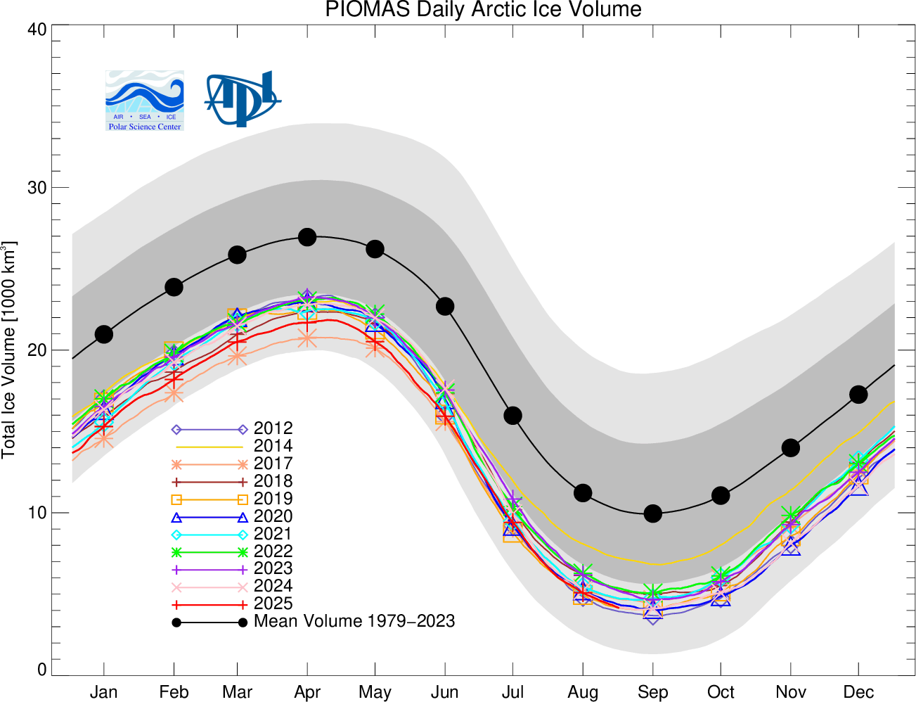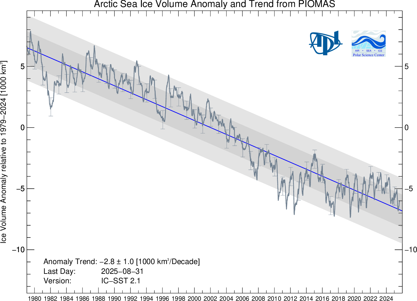 https://psc.apl.uw.edu/research/proj...olume-anomaly/ Maandelijkse update augustus 2025 [Septemberupdate vertraagd vanwege de sluiting van de Amerikaanse overheid, waardoor gegevens niet beschikbaar waren] Het gemiddelde volume zee-ijs in het Noordpoolgebied bedroeg in augustus 2025 5,15 x 103 km³. Deze waarde is de op twee na laagste ooit gemeten voor augustus, ongeveer 0,2 x 103 km³ boven het lage record voor augustus in 2012. Het maandelijkse ijsvolume lag 72% onder het maximum in 1979 en 54% onder de gemiddelde waarde voor 1979-2024. Het gemiddelde ijsvolume in augustus 2025 lag 0,8 standaarddeviaties boven de trendlijn van 1979-2024. Het ijsverlies voor 2025 lag dicht bij het maximum van het recente decennium (Figuur 4), met een minimale gemiddelde ijsdikte eind augustus. De kaart met afwijkingen in de ijsdikte voor augustus toont nog steeds positieve afwijkingen in de oostelijke Beaufortzee, enkele sterke negatieve afwijkingen ten noorden van Groenland en kleinere negatieve afwijkingen in het hele Noordpoolgebied. Het dikkere zee-ijs dan normaal in de Beaufortzee is een nasleep van de abnormaal sterke advectie van ijs naar het gebied, die eerder dit jaar plaatsvond (van maart tot en met juli) (Fig. 8 en 9). Het zee-ijs in de Beaufortzee was in juli nog steeds uitgebreid, met ijs dat bijna de kust bereikte, maar er was al sprake van zware ijsplassen (zie foto van onze SIZRS-vlucht in juli, Fig. 10). Dit heeft waarschijnlijk geleid tot een snelle afname.