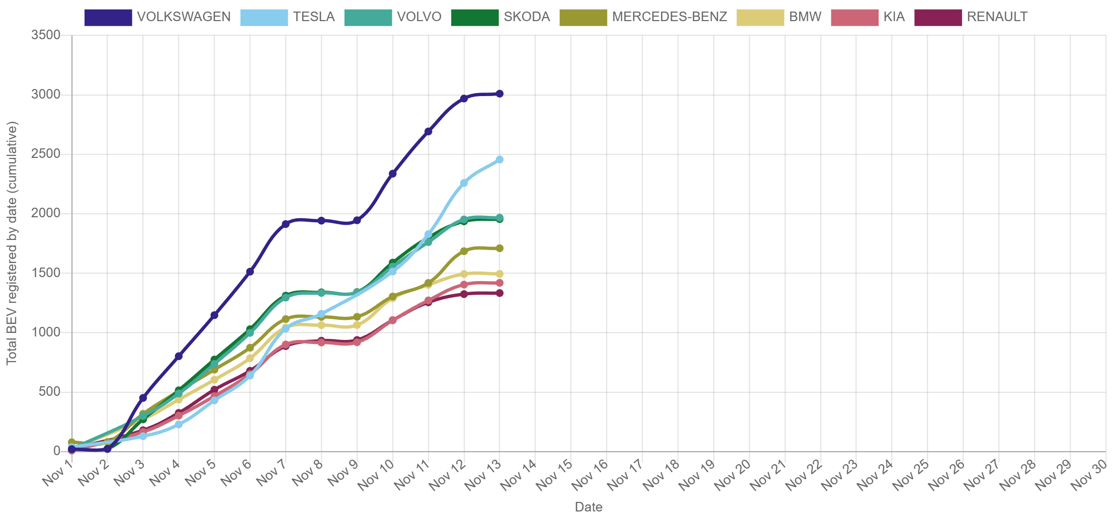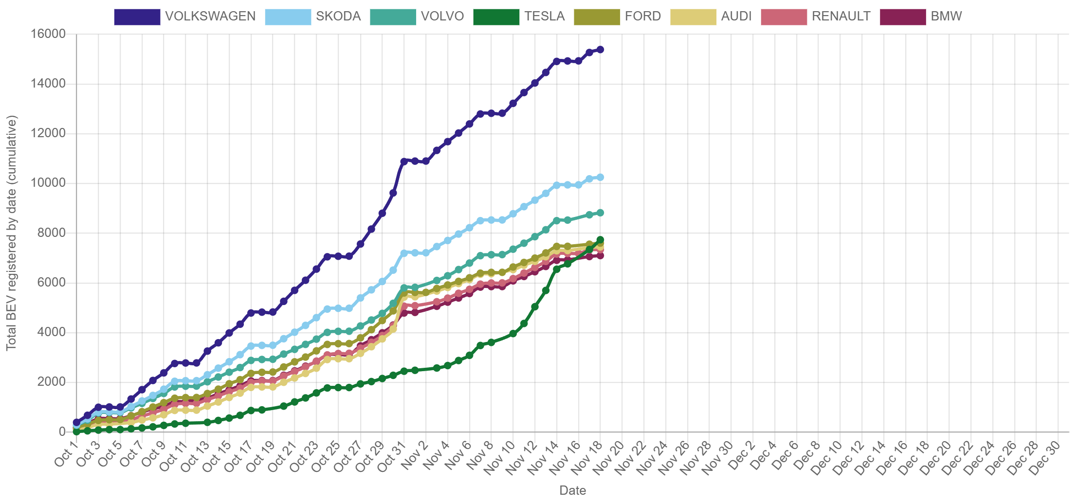 In Noorwegen werden de laatste 4 dagen minstens 852 Teslas nieuw ingeschreven, de 40 dagen ervoor of vanaf 1 oktober tem 9 november werden er 769 Teslas ingeschreven: https://teslastats.no/