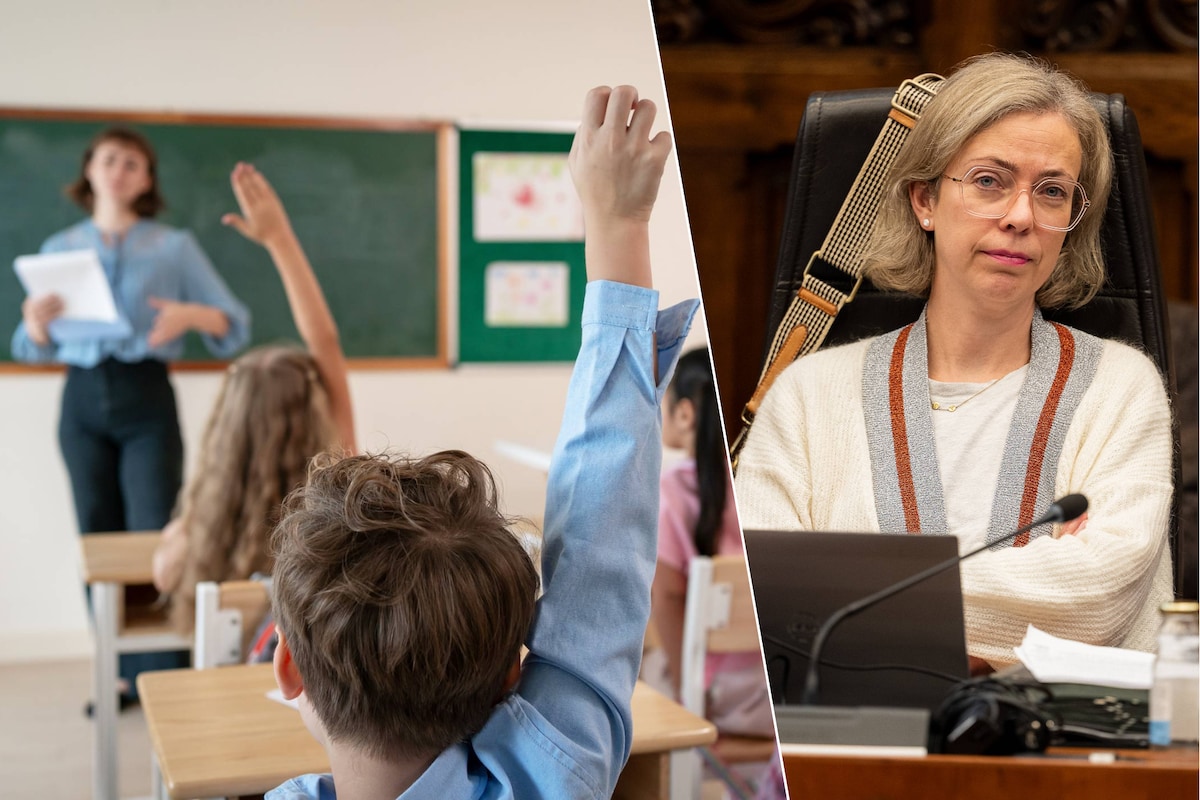 Foto links: een beeld ter illustratie. Voor alle duidelijkheid niet de klas in kwestie. Foto rechts: schepen van Onderwijs Evita Willaert. Citaat: