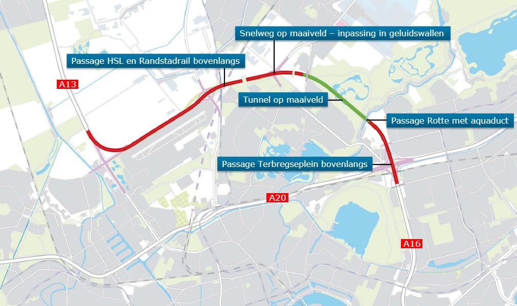 Rondom Rotterdam zijn de oorspronkelijk geraamde kosten zelfs meer dan verdubbeld (na 14 jaar) van een ontlastende 3+3-snelweg van 10 km inclusief 2,2 km landtunnel incl. aquaduct: (duur van de bouw tot opening bijna 7 jaar)