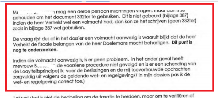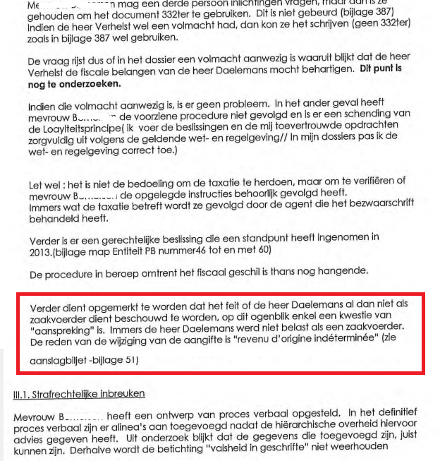 In de Waalse 'officiële' versie is er zelfs geen sprake van een vermoeden van belastingfraude. Johan Daelemans heeft gewoon op straat een zak geld gevonden waarin een half miljoen euro stak. Die centen zijn door Johan Daelemans (*) in kleinere coupures cash aan Patrick Coumans gegeven om vervolgens in de vennootschap van Patrick Coumans te investeren. Dit is wat de fiscus vandaag laat doorgaan als een verklaring voor de herziening inkomstenbelasting begin 2010 doorgestuurd naar Johan Daelemans... Bewijzen voor die onzin … onbestaand (of had iemand wat anders in gedachten? We kunnen vandaag de info uit strafdossier naast de zever van de fiscus leggen. Pijnlijke zaak. Indien ik bij de fiscus zou werken, ik zou dat niet meer openlijk durven zeggen. (*) In het intern onderzoek staat letterlijk: Dat mijnheer Daelemans door de ambtenaren in hun correspondentie foutief als zaakvoerder naar voor wordt geschoven is op zich niet relevant. Mijnheer Daelemans is belast op inkomsten van ongekende oorsprong. Het bewijs van die inkomsten zijn de cash betalingen van Johan Daelemans aan Patrick Coumans in de loop van boekjaar 2007... Bron? 12 pintjes kasteelbier?