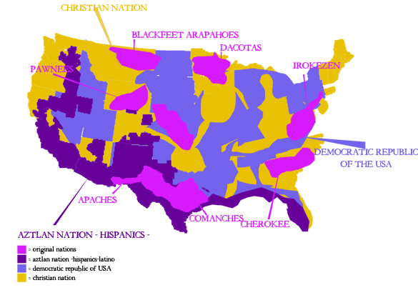 Wat een toeval! Ik vond net een gelijkaardige denkoefening van een bekende denktank (Kommunist Anti-American ThinkDank) in hun tijdschrift Unarmed Kaatd Journal. Daarin stond een artikel over 'The Untied States of Amnesia", waarin de kaart van de VSA wordt hertekend naar ethnisch/religieuze/politieke maatstaven.