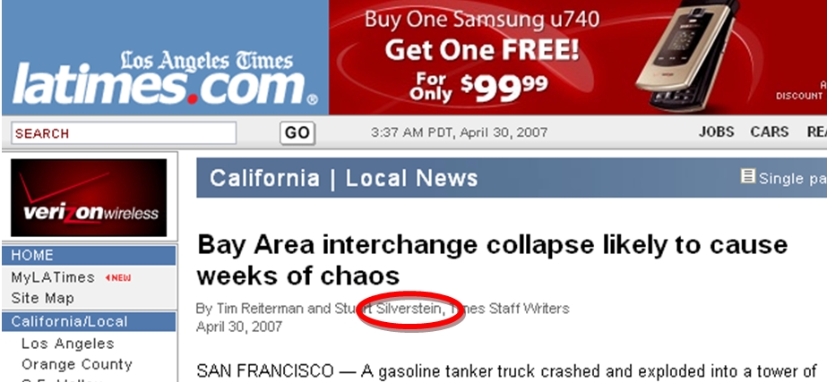 Dat deze instorting door explosieven moet zijn getriggerd lijkt me evident!. Zoals iedereen wel weet is immers nooit eerder in de geschiedenis een stuk snelweg gesmolten en ingestort onder invloed van brand. Het verhaal van die 'tanker'wagen is dan ook duidelijk een cover-up. De eerste bewijzen van explosieven beginnen trouwens al op te duiken : Uit de LA Times : Citaat: