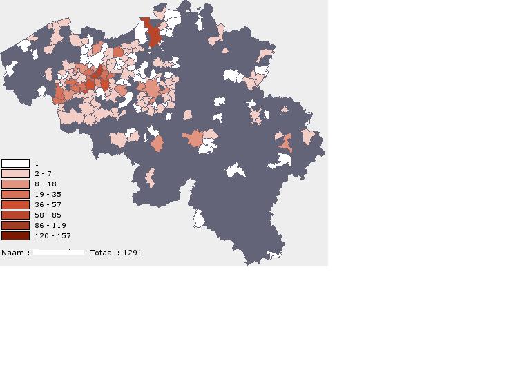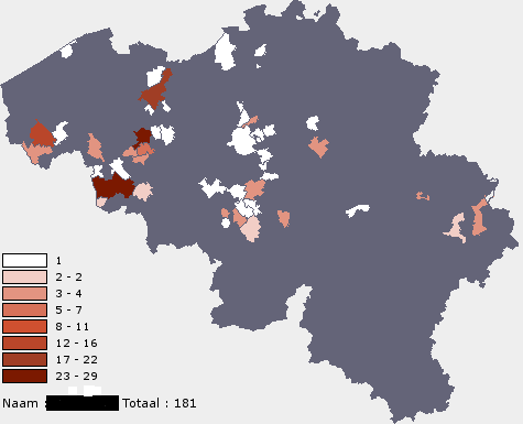 Ik kan aannemen dat er ook hervomden mijn naam droegen ![]() Verder is mijn naam in de grote Vlaamse steden (en de omliggende gemeenten) vertegenwoordigd maar helemaal niet in de Limburg. Ook zijn er mensen die mijn naam dragen ingewijkt in de Waalse nijverheidsgebieden. Dit is ook een leuk webstek: http://statbel.fgov.be/nam/nl/default.asp |