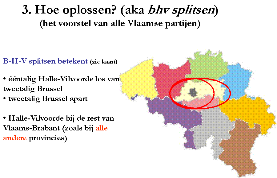 ![]() BHV over gaat is het volgende: De taalgrens in België werd bij wet vastgelegd op 8 november 1962. Dat gebeurde met een democratische meerderheid van Vlamingen en Franstaligen. Een jaar later werd de taalwetgeving voor bestuurszaken grondig hervormd. In die bestuurstaalwet werd het begrip taalgrens verbonden met het begrip taalgebied. België werd toen opgesplitst in vier taalgebieden: -het Nederlandse taalgebied, -het Franse taalgebied -het Duitse taalgebied en -het tweetalige gebied Brussel-Hoofdstad. Elke Belgische gemeente maakt ondubbelzinnig deel uit van één - en niet meer dan één - van die vier taalgebieden. De taalgebieden die de bestuurstaalwet in 1963 had vastgelegd werden in 1970 ook verankerd in de Grondwet. Ook dat is gebeurd met een democratische meerderheid van Vlamingen en Franstaligen. Meteen werd ook voor eens en voor altijd afgesproken hoe men de taalgrenzen en de taalgebieden in de toekomst kan wijzigen. Men wou verhinderen dat dergelijke wijzigingen om de haverklap zouden optreden. Als elke nieuwe regering meteen ook een nieuwe taalgrens zou invoeren, zou dat het samenleven van de taalgemeenschappen in België onmogelijk maken. Maar daarnaast wou men ook verhinderen dat één enkele taalgemeenschap de macht zou krijgen om de taalgrens op eigen houtje te hertekenen. Daarom kan de taalgrens alleen worden gewijzigd als daarvoor in het federale parlement een bijzondere meerderheid bestaat. Dat betekent dat het wijzigingsvoorstel in de twee kamers van het federale parlement een tweederde meerderheid achter zich moet krijgen en dat in elke taalgroep een meerderheid van de parlementsleden achter de wet moet staan. De taalgrens kan dus maar worden gewijzigd als daar zowel bij Nederlandstalige als bij Franstalige parlementsleden een meerderheid voor wordt gevonden. Vlamingen en Franstaligen kunnen de taalgrens nooit eenzijdig veranderen. Eigenlijk kunnen we er van uitgaan dat de taalgrens de facto vastligt. Het begrip "taalgebied" is niet louter beschrijvend bedoeld. Het is wel degelijk een juridisch begrip. Met het Nederlandse taalgebied bedoelt men dus niet het gebied waar feitelijk Nederlands wordt gesproken. Neen, het is het gebied waar het Nederlands moet worden gebruikt voor een aantal domeinen die de wet uitdrukkelijk opsomt - bestuur, onderwijs, justitie, bedrijfsleven. Het Nederlandse taalgebied - Vlaanderen dus - is eentalig Nederlands. Dat doet natuurlijk niets af aan de grondwettelijk gewaarborgde taalvrijheid. Wie in het Nederlandse taalgebied woont, mag in de privé-sfeer de talen gebruiken die hij wil. Alleen "voor handelingen van het openbaar gezag en voor gerechtszaken" is dat anders: daar is het Nederlands verplicht. (kopie van http://www2.vlaanderen.be/taalwetgev...lgebieden.html). Bovenstaande is niet zomaar een vodje papier (Tindemans), maar is een deel van de grondwet die gestemd werd door 2/3 van Vlamingen en 2/3 van Franstaligen. Dit is niet opgelegd door Vlaanderen of whatever, nee de Franstaligen gingen akkoord met deze belangrijke wet, die een van de basisprincipes voor de werking van België vastlegt. Deze wet werd steeds zeer strikt toegepast door de Franstaligen voor anderstaligen (meestal Vlamingen) in Wallonië en Brussel. Maar andersom werd vanaf dag 1, nu reeds meer dan 45 jaar dus, deze wet vooral rond Brussel met voeten getreden door de Franstaligen op Vlaams taalgebied. Wat BHV nu eigenlijk is, is dat de Franstaligen na 45 jaar overtreden van de grondwet het recht vragen om ofwel: 1- indien hen dat uitkomt deze grondwet verder te mogen negeren en met voeten treden (status quo) ofwel: 2- indien de Vlamingen willen dat de Franstaligen de grondwet volgen, moeten de Vlamingen daar zwaar voor betalen. Dit is feitelijke chantage en nadien zal blijken dat de Franstaligen nog immer lustig verderdoen, of 3- dat als beloning voor het niet volgen van de grondwet de Franstaligen hun gebied mogen uitbreiden. Dit laaste is dan een vrijgeleide om in de toekomst dit te blijven herhalen. De mensen die BHV na het lezen van bovenstaande afdoen als een detail, als een agressieve Vlaamse eis van vaandelzwaaiers, als gezever van de Vlaamse egoïst… en andere aantijgingen die vooral door Franstalige politici worden gelanceerd om de kern van de zaak te verdoezelen, weten niet waar het over gaat. Een federaal land als België kan niet meer blijven bestaan als één bevolkingsgroep georganiseerd zich niet houdt aan vastgelegde afspraken in de grondwet, DE basis van een land. DAT en niets anders is waar BHV over gaat!