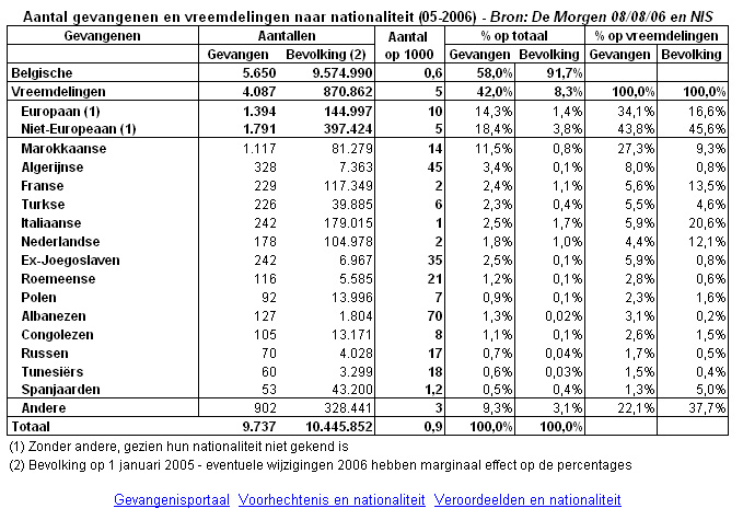 |   Citaat: By the way, uw 10 % klopt dus niet. Ik zit al aan 18 % voor 2006 als ik de vreemdelingen uit moslimlanden optel. Bovendien maken deze cijfers geen onderscheid tussen zware en minder zware misdaden, toch het criterium van uw betoog. En de vreemdelingen met Belgische nationaliteit, in welke categorie werden die ondergebracht, onder 'vreemdelingen' of onder 'Belgische'? Laatst gewijzigd door Gilette : 31 januari 2009 om 15:13. | |