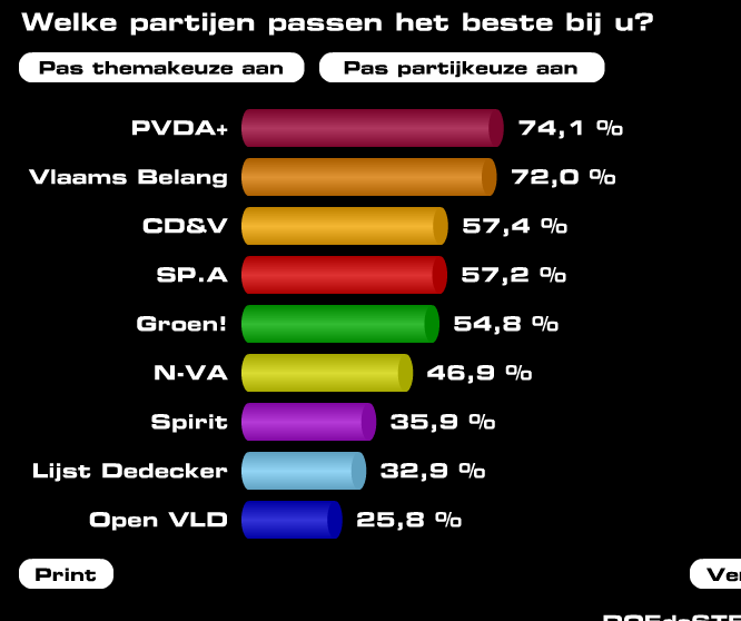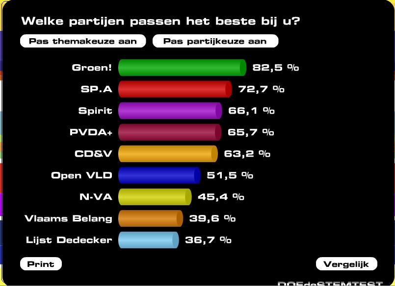 Net ook nog eens gedaan en het enige verschil is dat N-VA bij mij op 2 staat, LDD op drie en PVDA achter Open VLD en SP.a komt. Maar het geeft wel ongeveer weer hoe ik denk. Maar op LDD stemmen: no fucking way, om het eens in het goed Vlaams te zeggen.