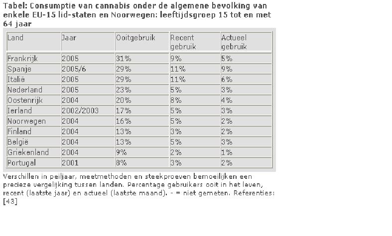 2) Die tabel toont enkel de cijfers voor jongeren onder de 15 en de 16 jaar. Als we (wat ruimer) gaan kijken naar een meer representatieve groep (15-64 jaar) dan zien we dat het gebruik in Nederland hoger ligt dan in België (het ooitgebruik ligt haast dubbel zo hoog in Nederland) |