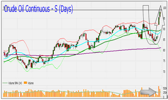 ![]() De olieprijs gaat weer door de kaap van de 105 dollar.
